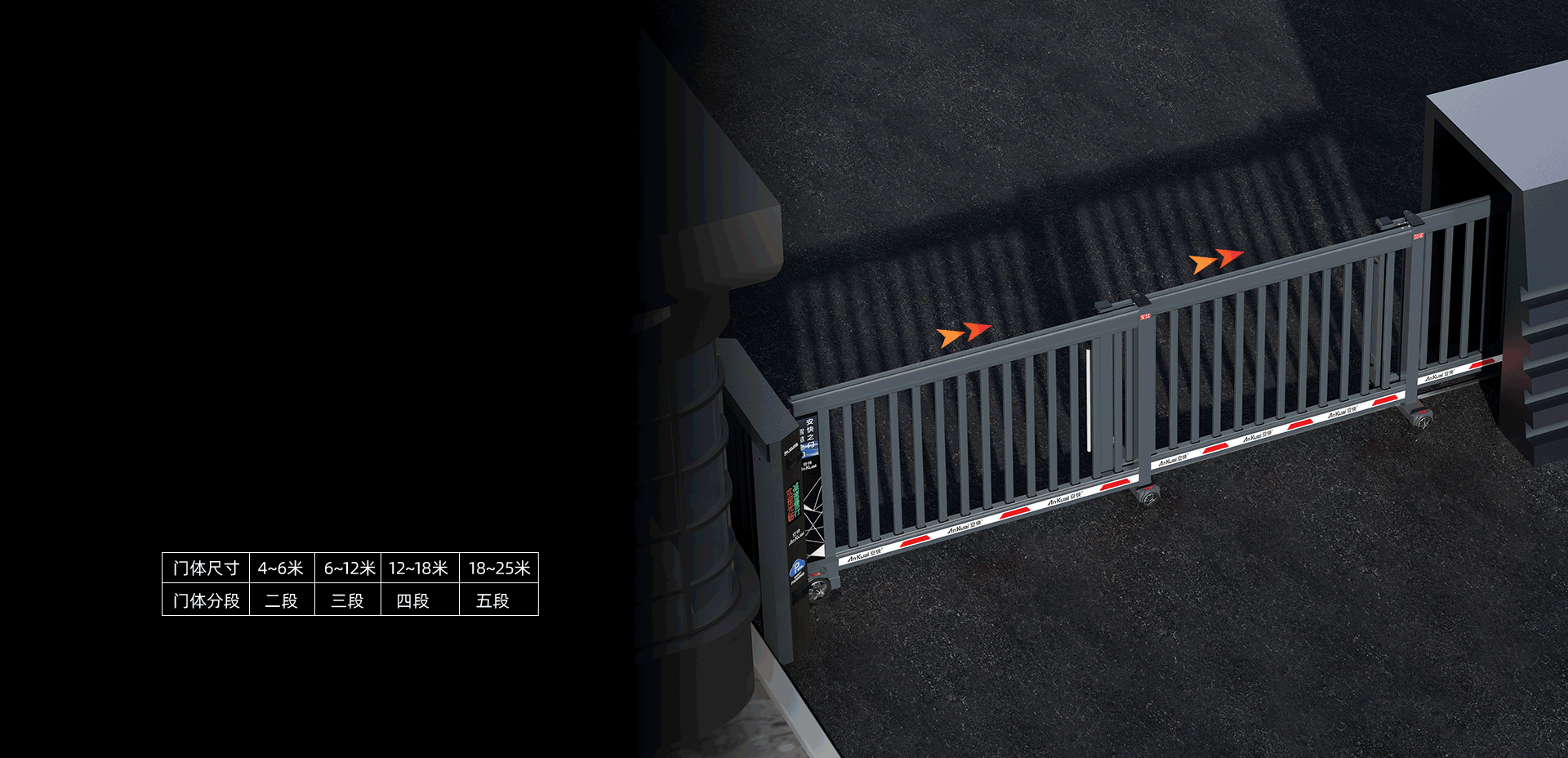 隱藏式循環(huán)走線技術(shù)分段直線行走開啟凈空大,關(guān)到位折普縮位小,解決超大門洞凈空要求的場所。