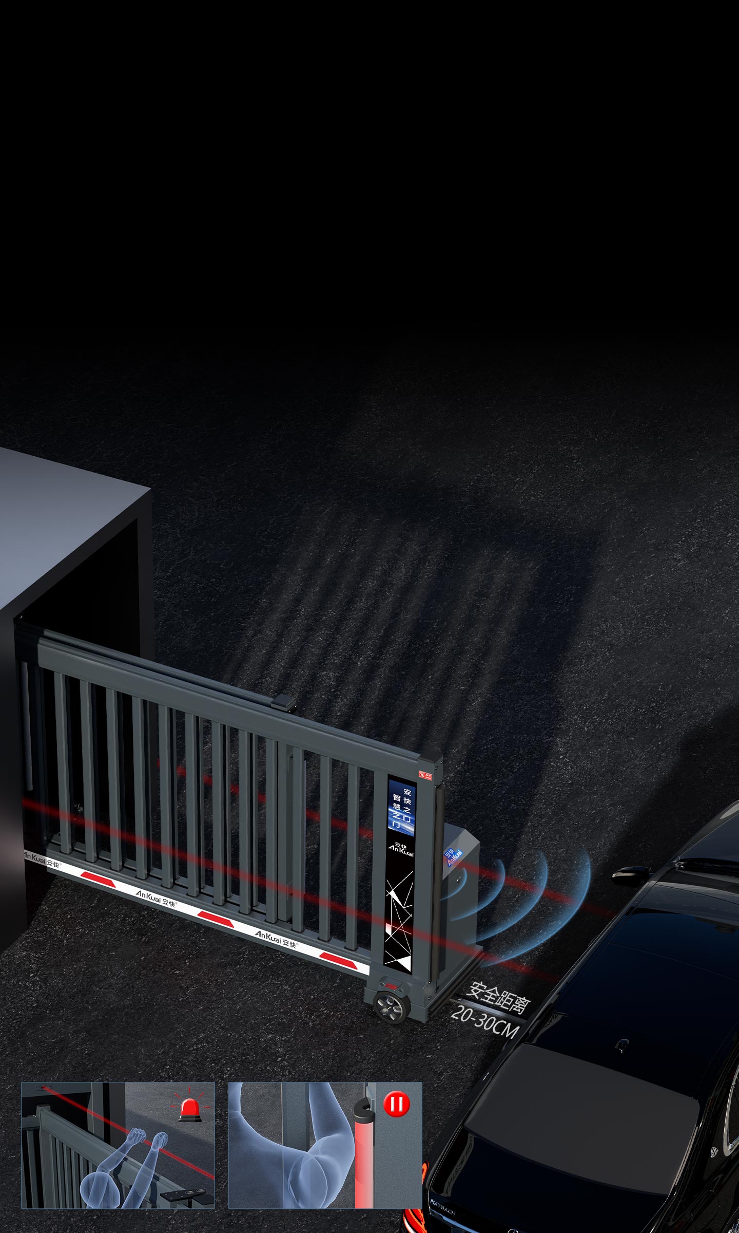 紅外防撞、防爬報警、防夾多重防護(hù)設(shè)計,運行中若有人或車經(jīng)過會自動停止并后退,保護(hù)人、車安全。